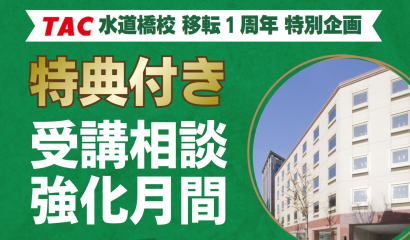 TAC水道橋校移転1周年を記念して、 水道橋校にて「公認会計士」「税理士」「公務員」に関する受講相談をされると、その場で【相談者特典】が、さらに<対象コース>の講座を申し込むと!【申込者特典】が、それぞれ受けられます。